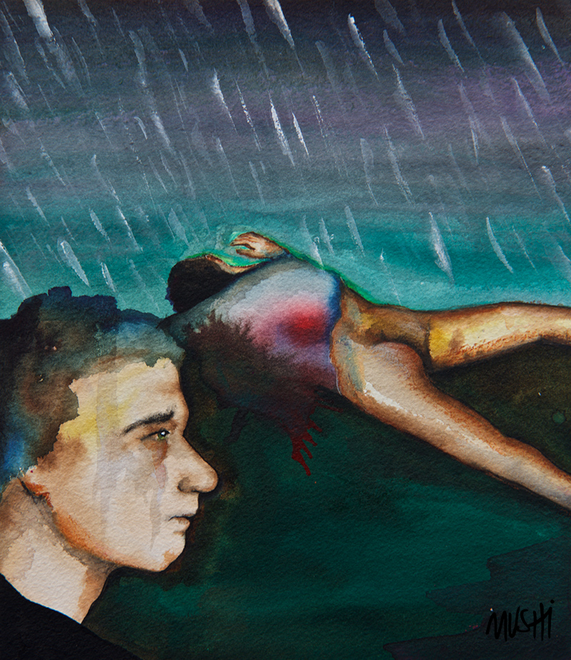 Entonces le marcó los dedos en el cuello hasta asfixiarlo, lo sacudió de los cabellos en abanico, lo apuñaló tantas veces como las gotas de lluvia que escondían su sangre; lo mató hasta hartarse, hasta quedar rendido bajo el amanecer opaco. Lo contempló sin saber qué sentir, sin saber casi qué había hecho. Lo miró y aún lo mira, a la espera de que se levante, le seque el llanto y lo perdone.