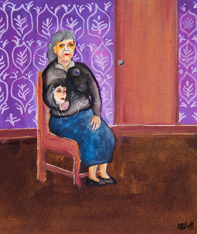 La mujer se acerca a la sillita de mimbre arrinconada a un lado de la puerta. Sin pensar más se sienta y aguarda. Está lista para salir, para salir-a-ninguna-parte, como siempre; los ojos distraídos en sus manos de gruesas coyunturas y venas flácidas.